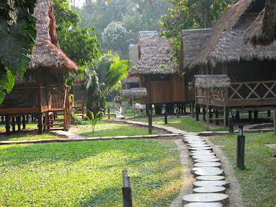 We flew from Lima over the Andes. We saw glaciers and sparkling turquoise and green lakes, emeralds and aquamarines glittering in the sun. Then on the East side of the Andes the rivers start and grow and grow like a tree until they form the mighty rivers that feed into the Amazon basin. We hoped we wouldn't see much de-forestation but as the plane comes into land everything we have read about is spread out beneath us. Large clearings, more being burned, the soil is so poor it is only good for a few years and then it is abandoned. They were in process of building a super highway into Puerto Maldanado. Good for lumber trucks. Won't be so good for the lovely feeling of isolation.